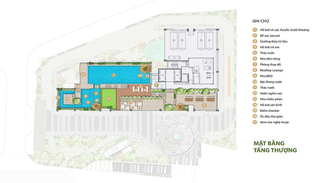 Phòng tập Technogym, Yoga, Pilates, Sauna, Golf 3D, Phòng tiệc, Công nghệ AR Khu chiếu phim, Khu BBQ, Hồ bơi vô cực Acrylic muối khoáng…