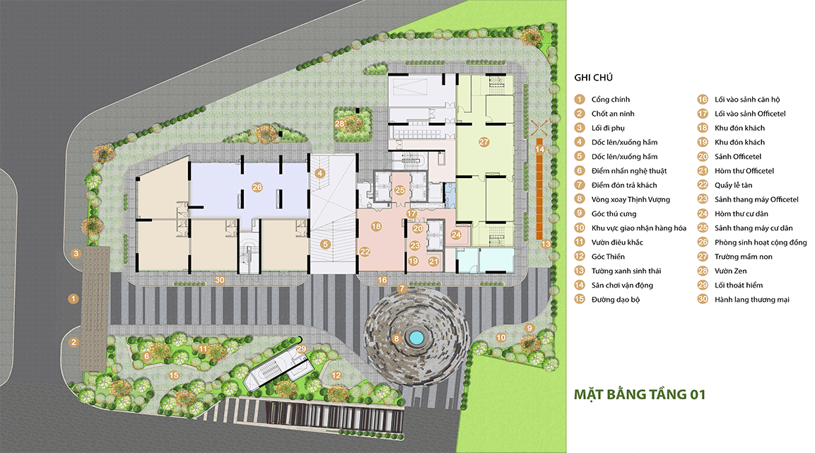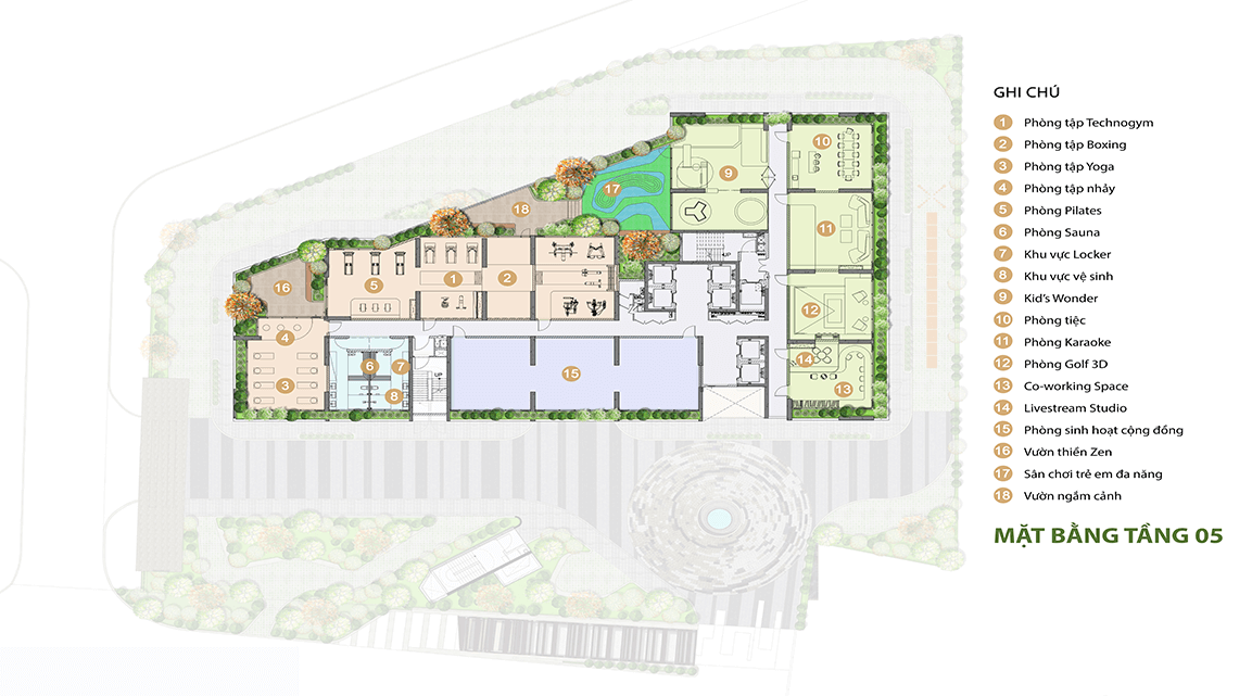 - Tầng 1 đến tầng 3: Khu vực thương mại, siêu thị mini, và các tiện ích công cộng như sảnh đón, phòng sinh hoạt cộng đồng, vườn treo.