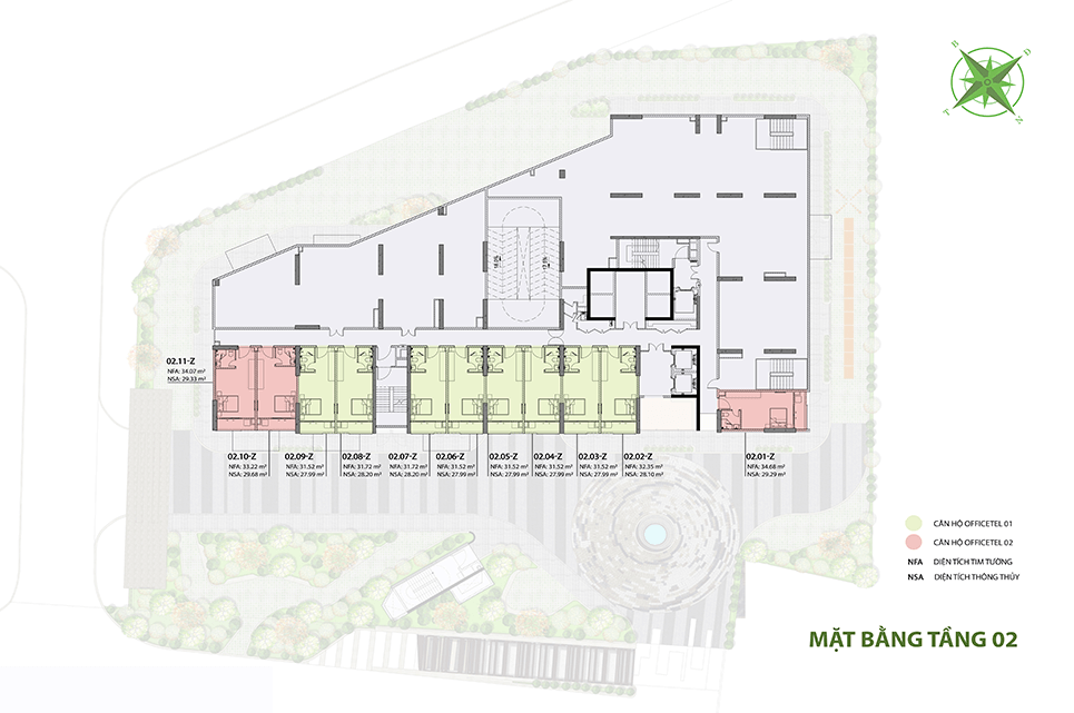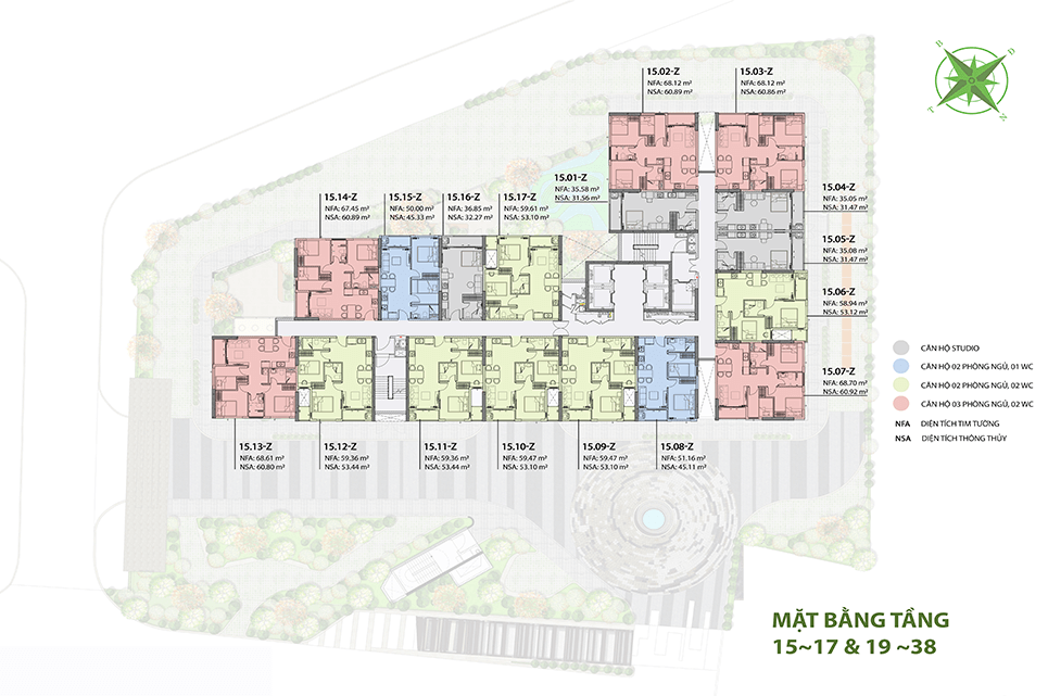 Tầng 4 đến tầng 21: Các căn hộ và officetel, với thiết kế tối ưu ánh sáng và không gian sống thoáng đãng. - Tầng 22 đến 38: Các căn hộ cao cấp với view đẹp, khu vực lounge, gym, và các tiện ích nghỉ dưỡng.