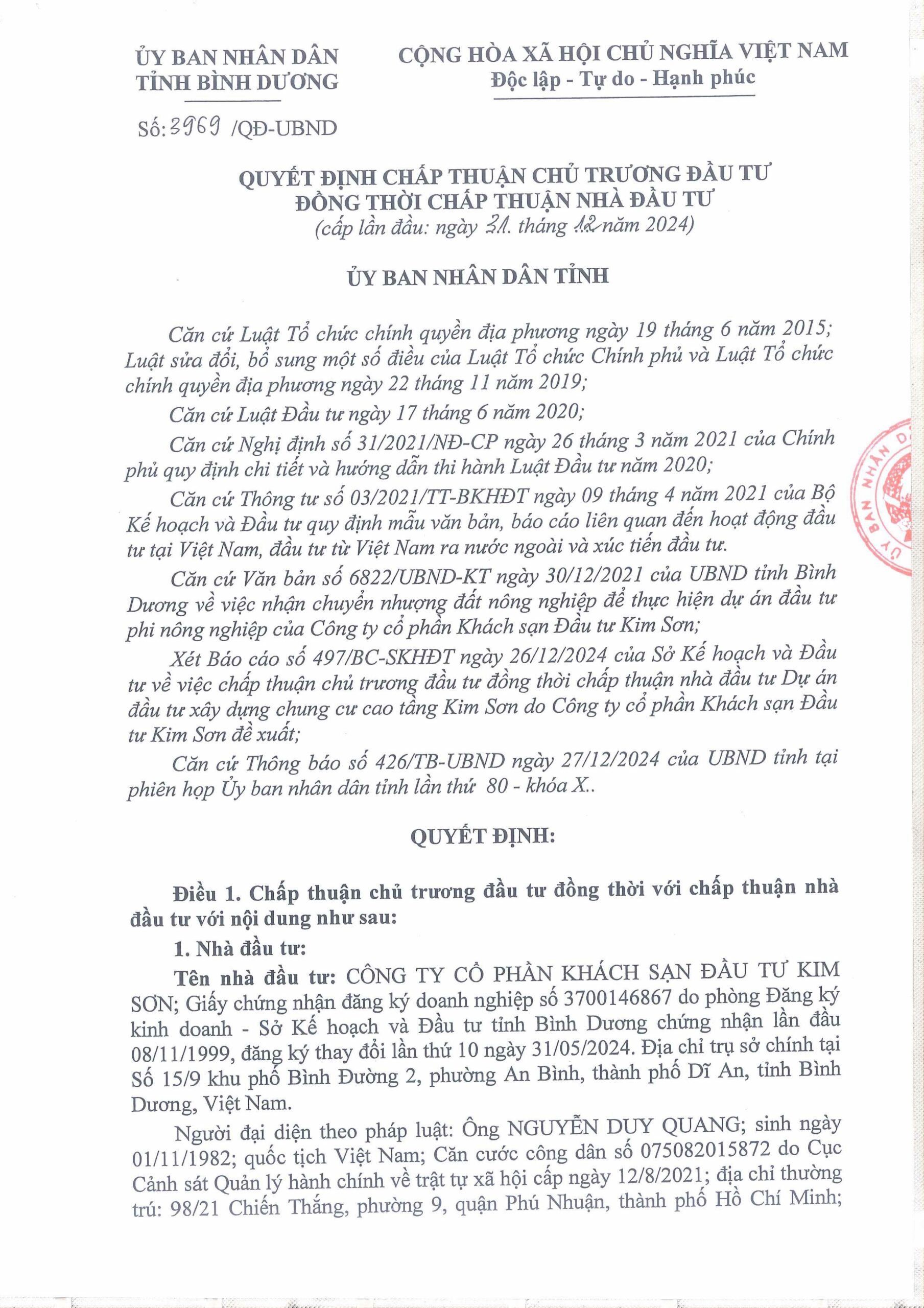 | Chủ Đầu Tư | Công ty Cổ phần Khách Sạn Đầu Tư Kim Sơn |